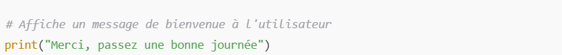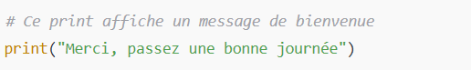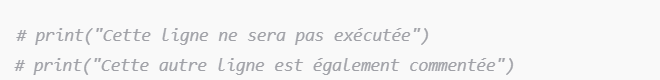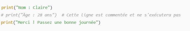 Explication : On peut commenter des lignes que l’on ne souhaite pas exécuter pour le moment. Cela permet de tester le code ou de garder des notes pour plus tard.
