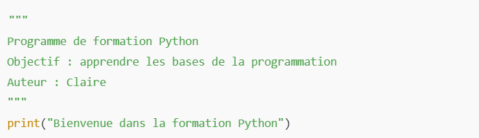 Python permet aussi de créer des commentaires sur plusieurs lignes à l’aide de trois guillemets (""" """ ou ''' '''). Cela est utile pour documenter des programmes plus complexes.