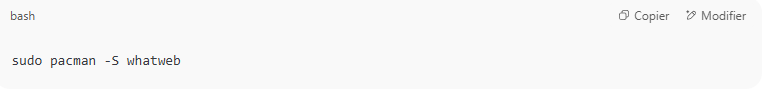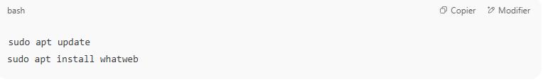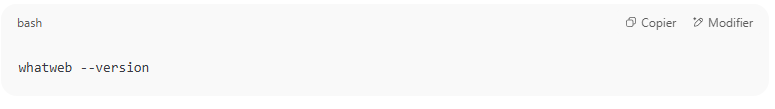 WhatWebest un outil puissant, mais il peut être détecté par certains systèmes comme un outil de reconnaissance hostile. Utilisez-le avec précaution.- Pour des tests passifs (moins détectables), préférez le mode sans interaction agressive.