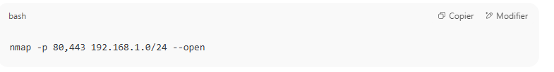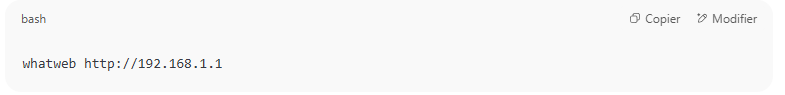 Avant d’utiliser whatweb, il faut d’abord savoir quels appareils dans votre réseau domestique hébergent une interface web (routeur, imprimante, caméra IP, NAS, etc.).